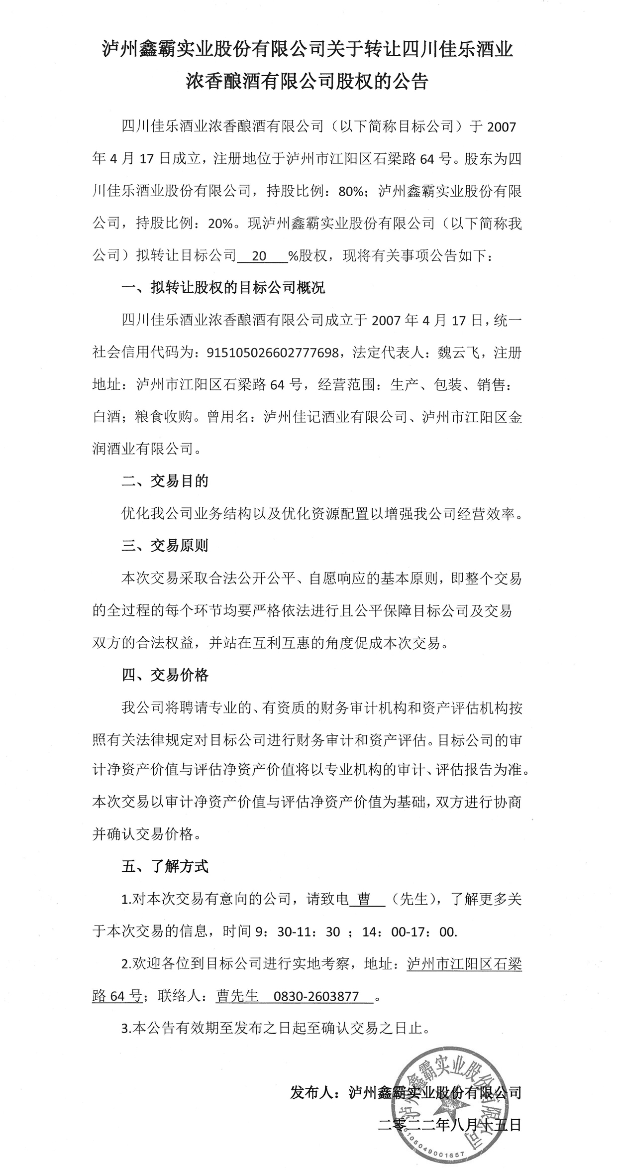 瀘州鑫霸實(shí)業(yè)股份有限公司關(guān)于轉(zhuǎn)讓四川佳樂(lè)酒業(yè)濃香釀酒有限公司股權(quán)的公告